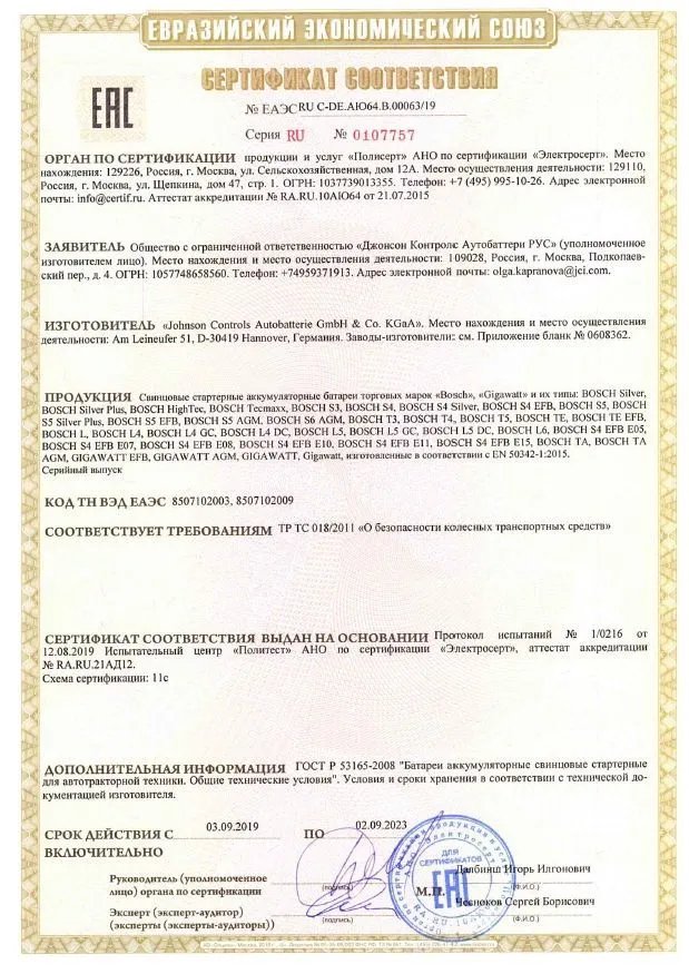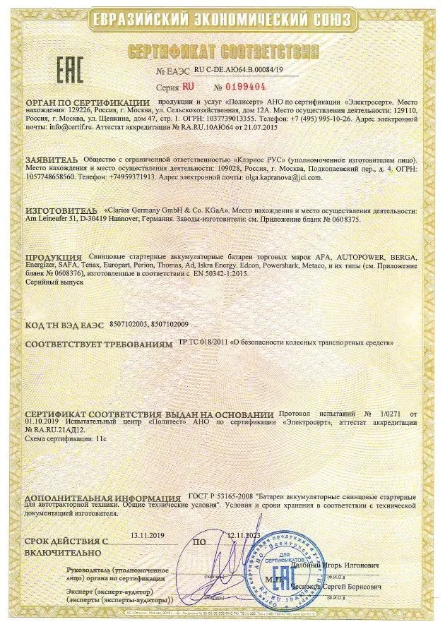 Сертификат соответствия Clarios (Германия)