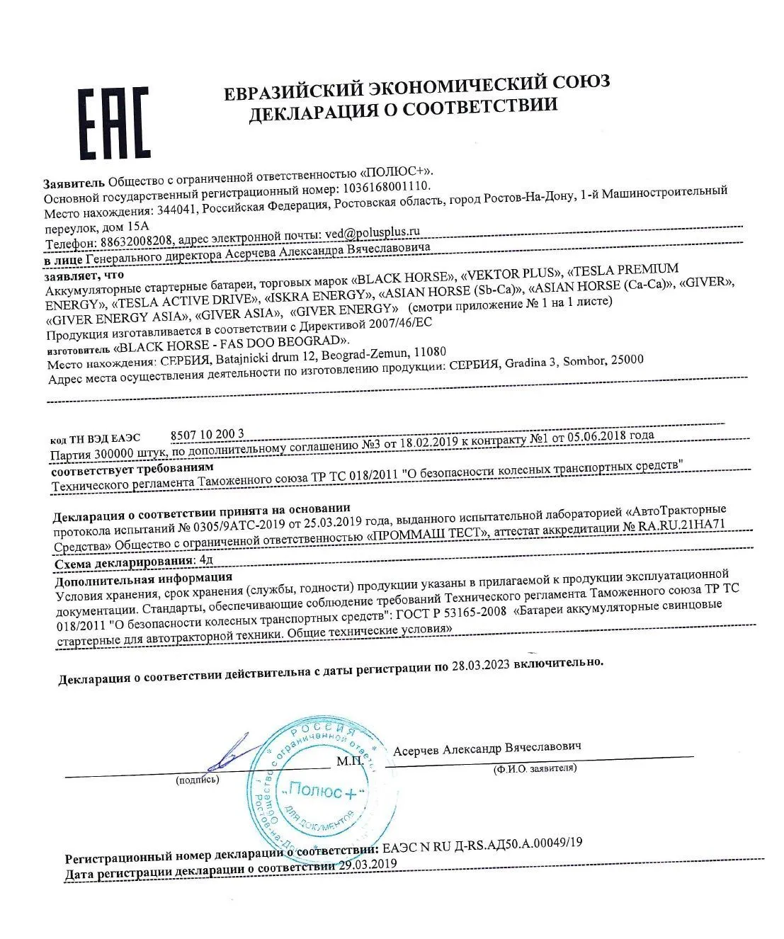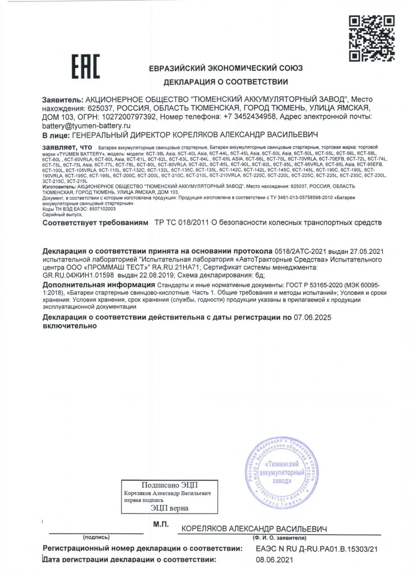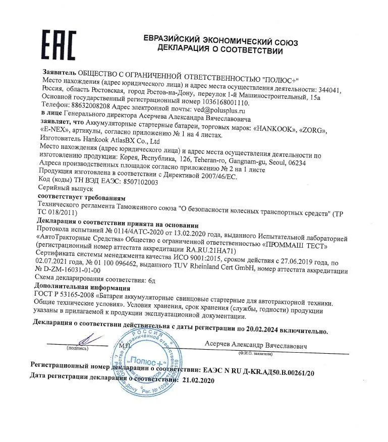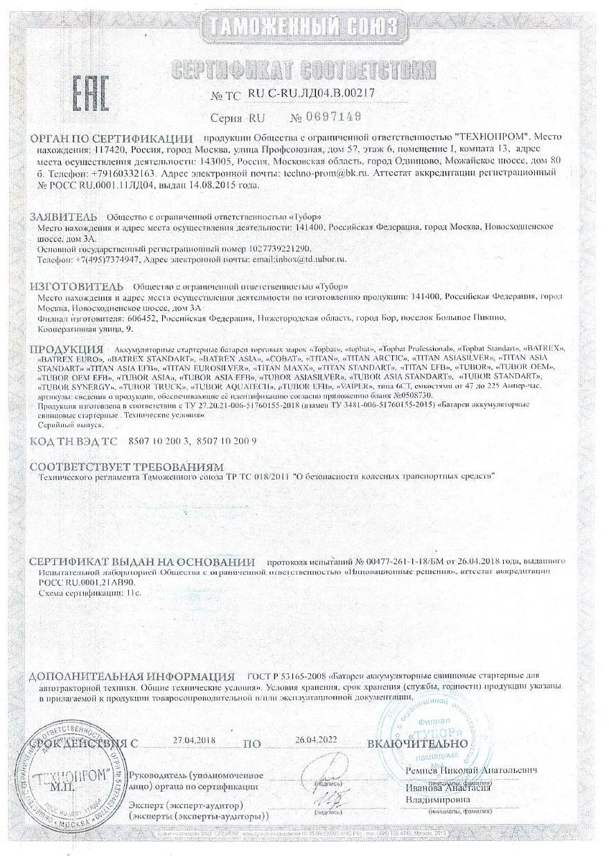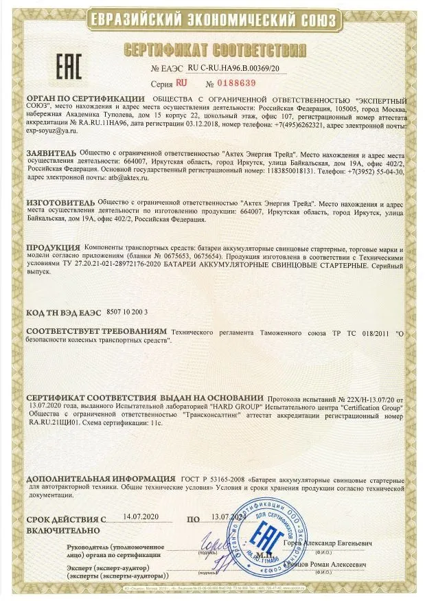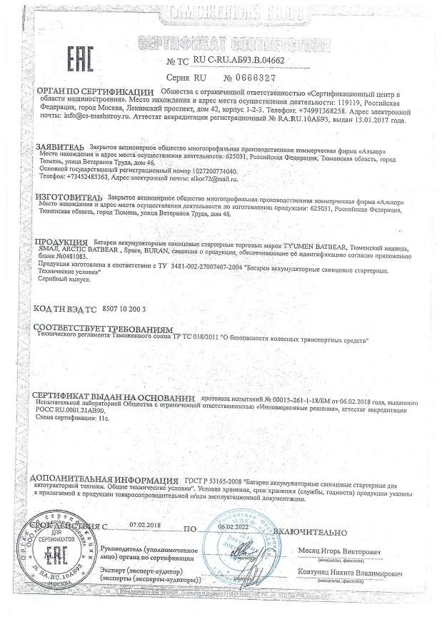 Сертификат соответствия Тюменский аккумуляторный завод (Россия)