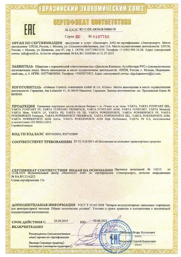 Сертификат соответствия Jonson Controls Varta мото (Германия)