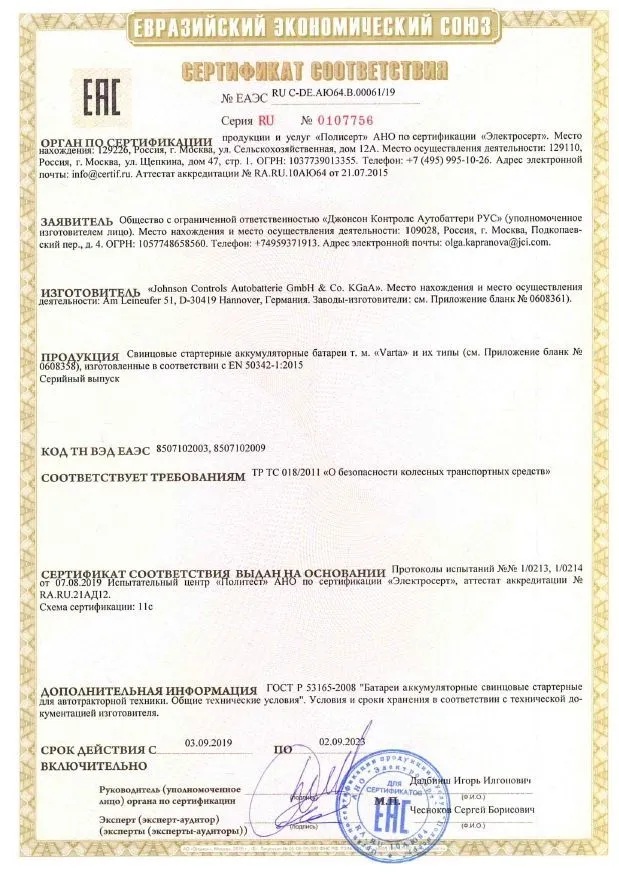 Сертификат соответствия Johnson Controls Varta (Германия)
