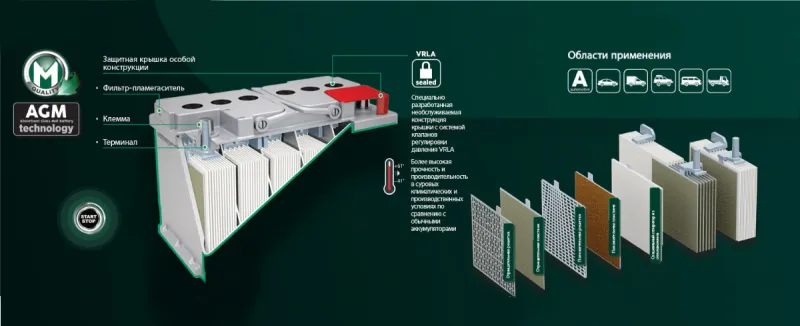 AGM (Absorbent Glass Mat) – технология абсорбирующего стекловолокна.